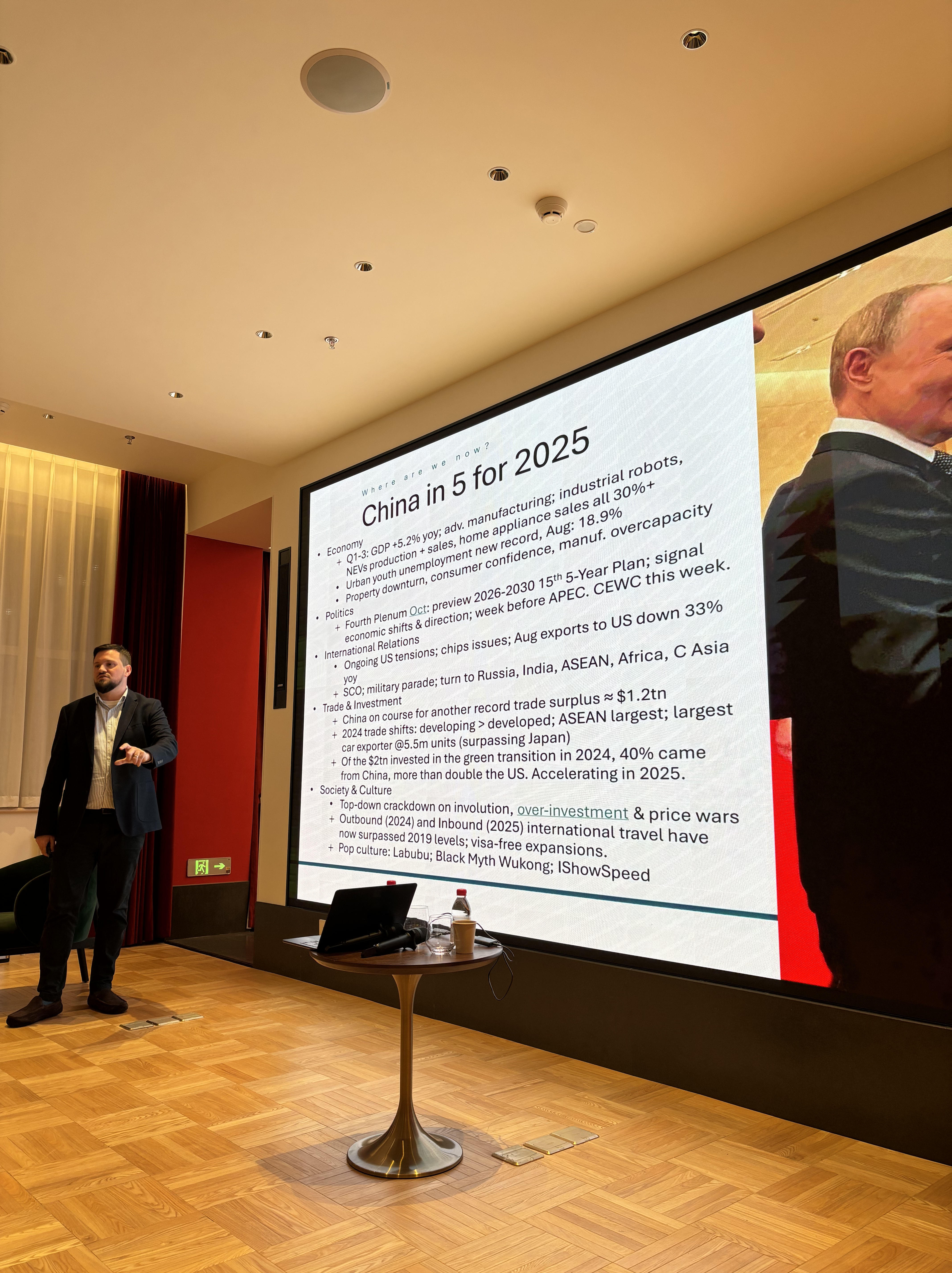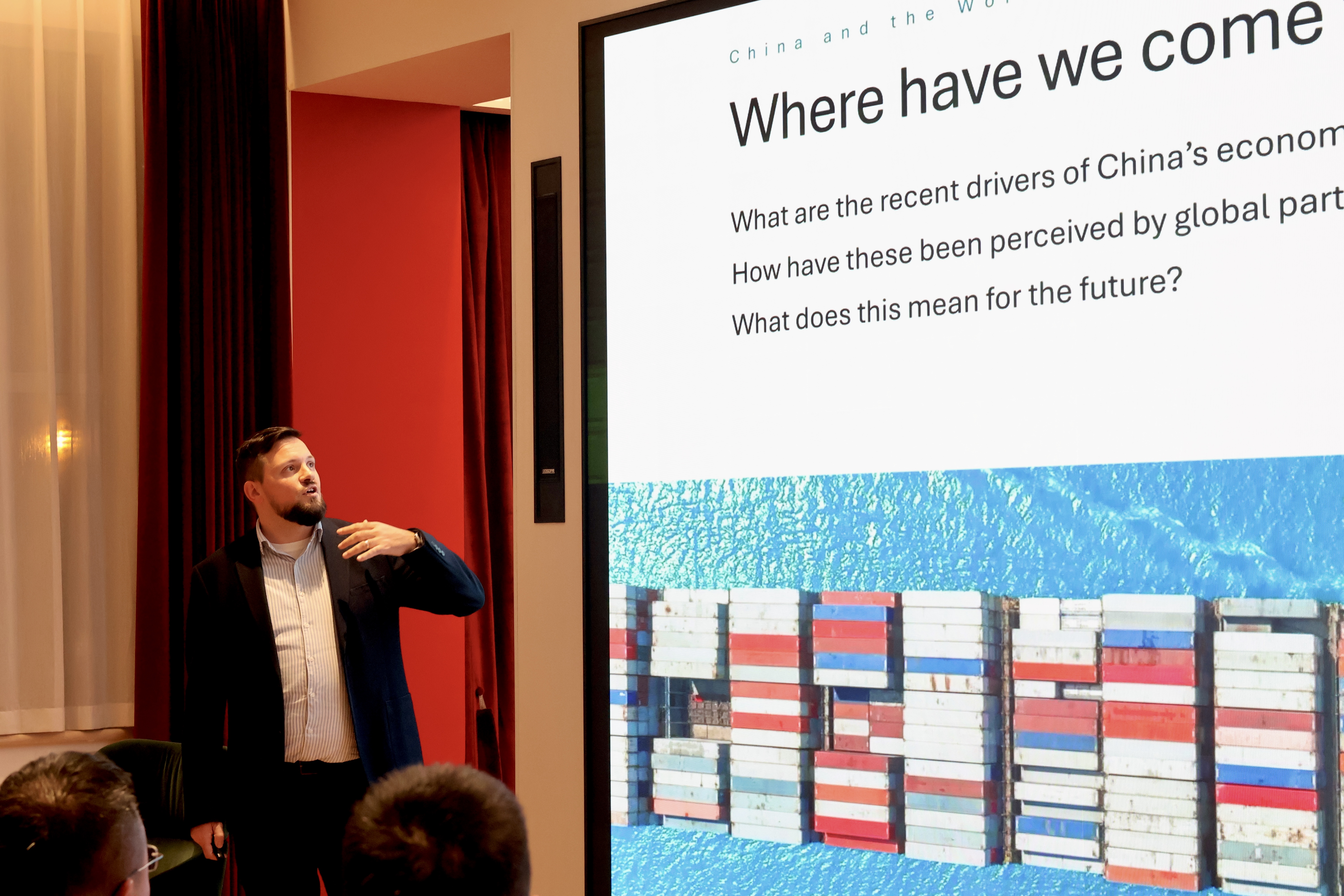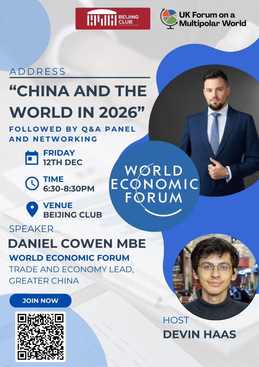 On the 12th December, the UK Forum on a Multipolar World Held a Joint event organised with the Yenching Academy, Peking University and hosted at the Beijing Club for International Dialogue. Daniel Cowen MBE, the World Economic Forum’s Trade and Economy lead for Greater China, gave a presentation on the recent trends in China’s economy including China’s global dominance of many industries, and potential structural issues facing China in the near future. This was followed by a panel discussion featuring independent economist Jian Lian (简练) and students from around the world.